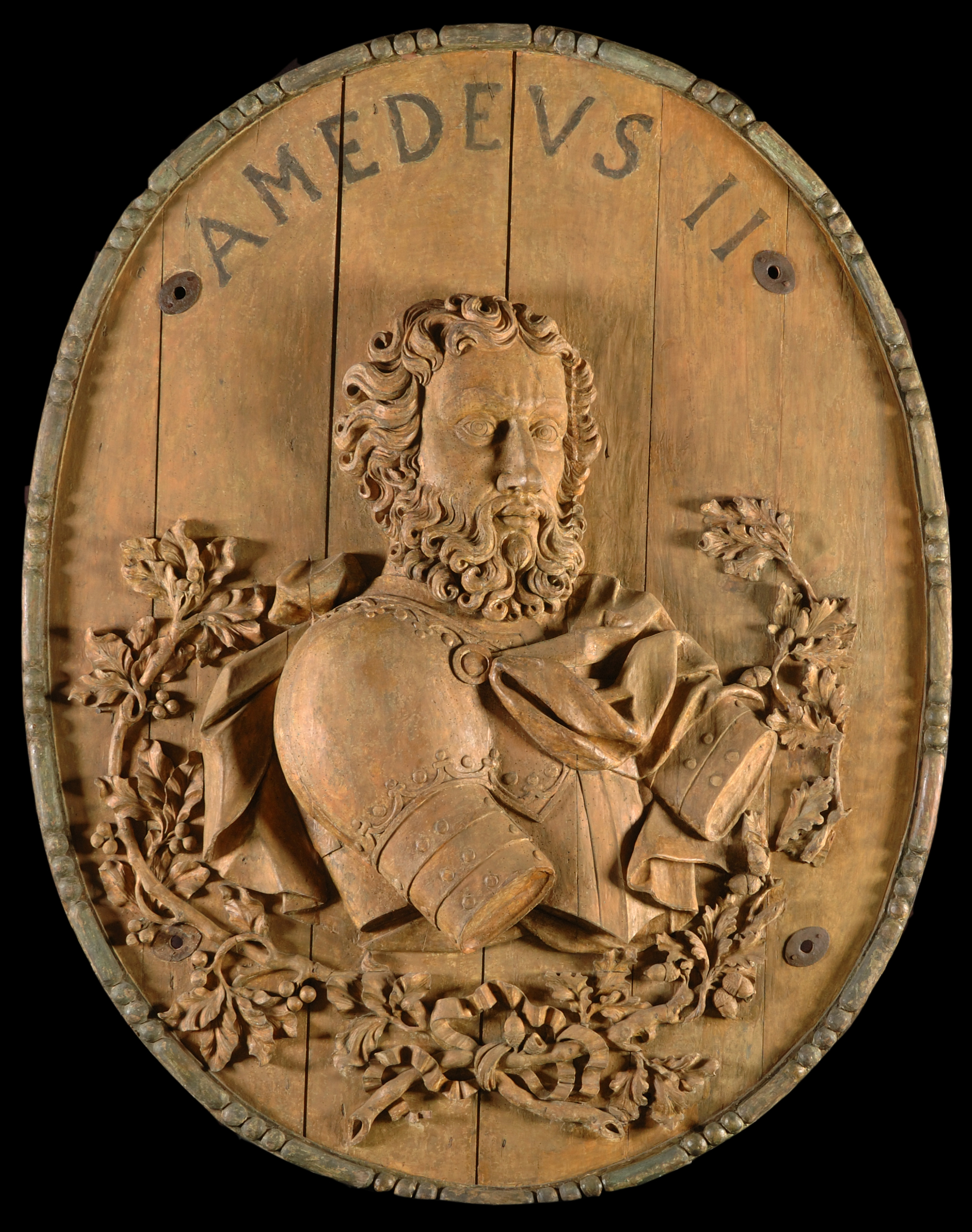 Il medaglione raffigura il ritratto del conte Amedeo II di Savoia (m. 1095), con un modello iconografico derivante dalla Augustae Regiaeque Sabaudiae Domus Arbor Gentilitia, scritta da F.M. Ferrero di Lavriano nel 1703 e incisa da G. Tasniére e P. Giffart su disegno del pittore di Annecy F. Josserme detto L'Ange, attivo a Torino tra il 1700 e il 1706. Il modello iconografico rimase il riferimento per tutto il Settecento e ancora della "Storia metallica" di L. Lavy (1757-1773), fino alle revisioni ottocentesche disegnate da F. Gonin intorno al 1830.